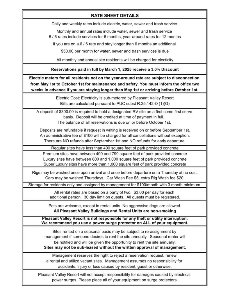 Explore our competitive RV park rates in Mission, TX. Pleasant Valley Resort offers affordable options for RV sites and park model rentals.